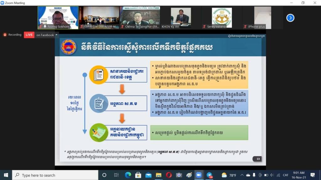 ខេត្តមណ្ឌលគិរី៖ នាព្រឹកថ្ងៃទី ១៦ ខែវិច្ឆិកា ឆ្នាំ២០២១ ឯកឧត្តម ថង សាវុន អភិបាល នៃគណៈអភិបាលខេត្តមណ្ឌលគិរី បានអញ្ជើញជាគណៈអធិបតីភាព ក្នុងកម្មវិធីសិក្ខាសាលាស្ដីពី ការកសាងអាជីវកម្មប្រកបដោយភាពជោគជ័យ តាមប្រព័ន្ធអនឡាញ(Zoom) ដោយមានការអញ្ជើញចូលរួមពីសំណាក់ លោកឧកញ៉ា តែ តាំងប៉ ប្រធានសម្ព័ន្ធសមាគមសហគ្រាសធុនតូច និងមធ្យមកម្ពុជា ព្រមទាំងមន្ទីរអង្គភាពពាក់ព័ន្ធ។