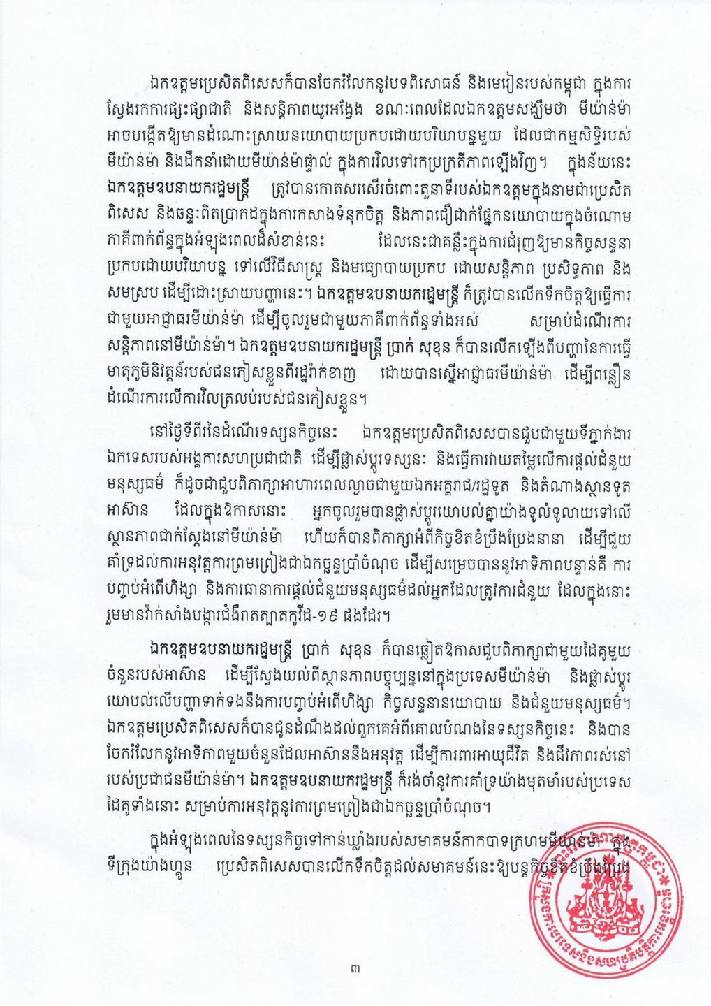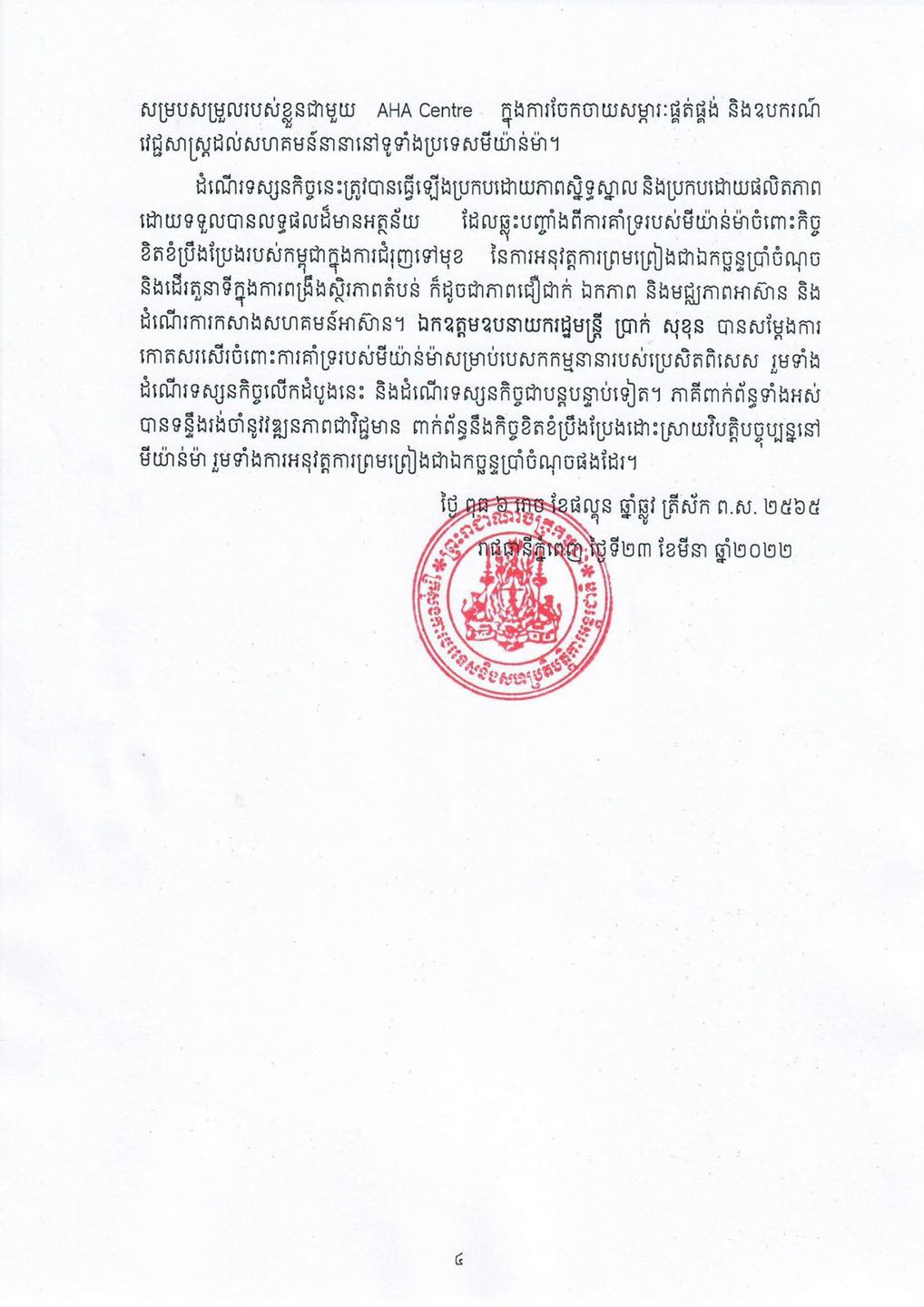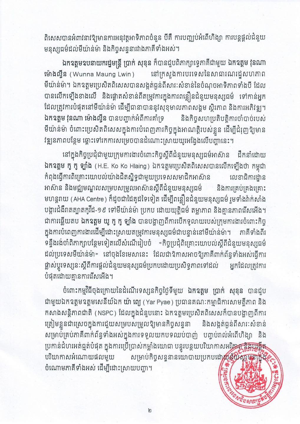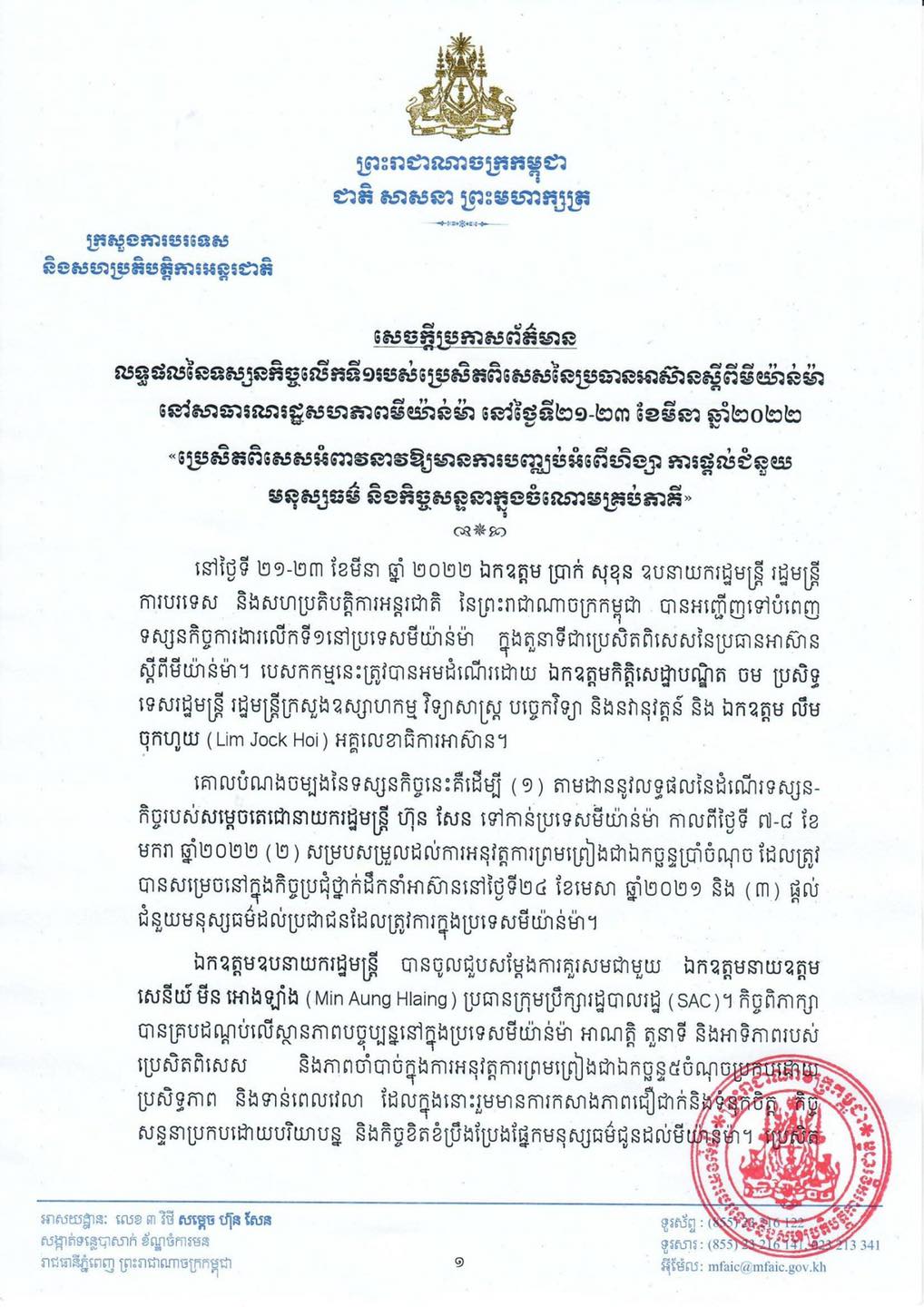 លទ្ធផលនៃទស្សនកិច្ចលើកទី១ របស់ប្រេសិតពិសេសនៃប្រធានអាស៊ានស្តីពីមីយ៉ាន់ម៉ានៅមីយ៉ាន់ម៉ា ៖«ប្រេសិតពិសេសអំពាវនាវឱ្យមានការបញ្ឈប់អំពើហិង្សា ការផ្តល់ជំនួយមនុស្សធម៌ និងកិច្ចសន្ទនាក្នុងចំណោមគ្រប់ភាគី»