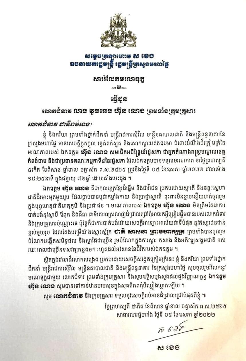 ស្ថិតក្នុងវេលាដ៏សោកសង្រេង ប្រកបដោយសេចក្តីសង្វេគក្រៀមក្រំនេះ សម្ដេចក្រឡាហោម ស ខេង និងលោកជំទាវ ព្រមទាំងថ្នាក់ដឹកនាំ មន្ត្រីរាជការស៊ីវិល មន្ត្រីនគរបាលជាតិ និងមន្ត្រីពន្ធនាគារ នៃក្រសួងមហាផ្ទៃ សូមចូលរួមរំលែកនូវ មរណទុក្ខជាមួយ លោកជំទាវ លាង វួចឆេង ហ៊ុន ណេង ព្រមទាំងក្រុមគ្រួសារ និងសូមឧទ្ទិសបួងសួងដល់ដួងវិញ្ញាណក្ខន្ធ ឯកឧត្តម ហ៊ុន ណេង សូមបានទៅកាន់ឋានបរមសុខក្នុងសុគតិភពកុំបីឃ្លៀងឃ្លាតឡើយ៕