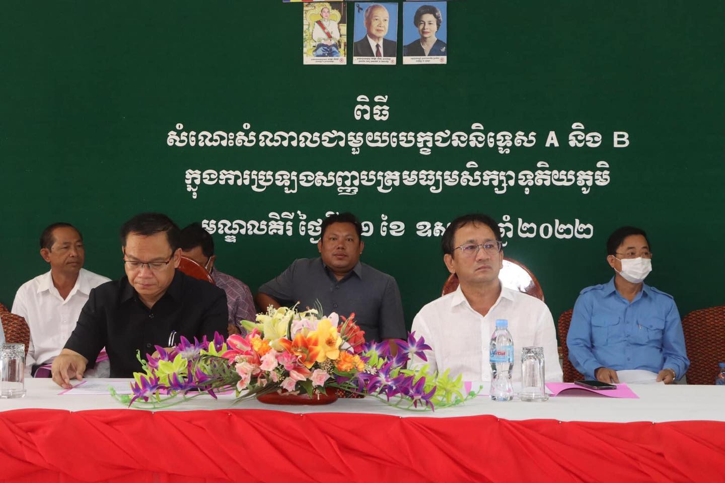 មណ្ឌលគិរី៖ ឯកឧត្តម ថង សាវុន អភិបាលខេត្តមណ្ឌលគិរី និងឯកឧត្តម ឧកញ៉ា អ៊ឹង ស៊ីតាតវិរៈ ជំនួយការផ្ទាល់សម្តេចកិត្តិព្រឹទ្ធបណ្ឌិត ប៊ុនរ៉ានី ហ៊ុន សែន ប្រធានកាកបាទក្រហកមកម្ពុជា និងប្រធានកិត្តិយសសាខាកាកបាទក្រហមកម្ពុជាខេត្ត បានអញ្ជើញជាអធិបតី ក្នុងពិធីសំណេះសំណាលជាមួយសិស្សានុសិស្សប្រឡងជាប់សញ្ញាបត្រមធ្យមសិក្សាទុតិយភូមិឆ្នាំសិក្សា២០២០-២០២១ និងប្រគល់រង្វាន់លើកទឹកចិត្តដល់សិស្សនិទ្ទេសA និងនិទ្ទេសB នៅខេត្ត ដែលប្រព្រឹត្តទៅនៅមន្ទីរអប់រំយុវជន និងកីឡាខេត្ត នាព្រឹកថ្ងៃទី១១ ខែឧសភា ឆ្នាំ២០២២។