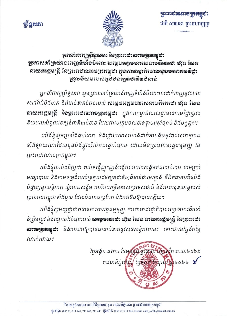 អ្នកនាំពាក្យព្រឹទ្ធសភា នៃព្រះរាជាណាចក្រកម្ពុជា ប្រកាសគាំទ្រយ៉ាងពេញកំហឹងចំពោះសម្តេចអគ្គមហាសេនាបតីតេជោ ហ៊ុន សែន នាយករដ្ឋមន្រ្តី នៃព្រះរាជាណាចក្រកម្ពុជា ក្នុងការកម្ចាត់ចោលនូវមនោគមវិជ្ជាជ្រុលនិយមរបស់ពូជជនក្បត់ជាតិ៣ជំនាន់
