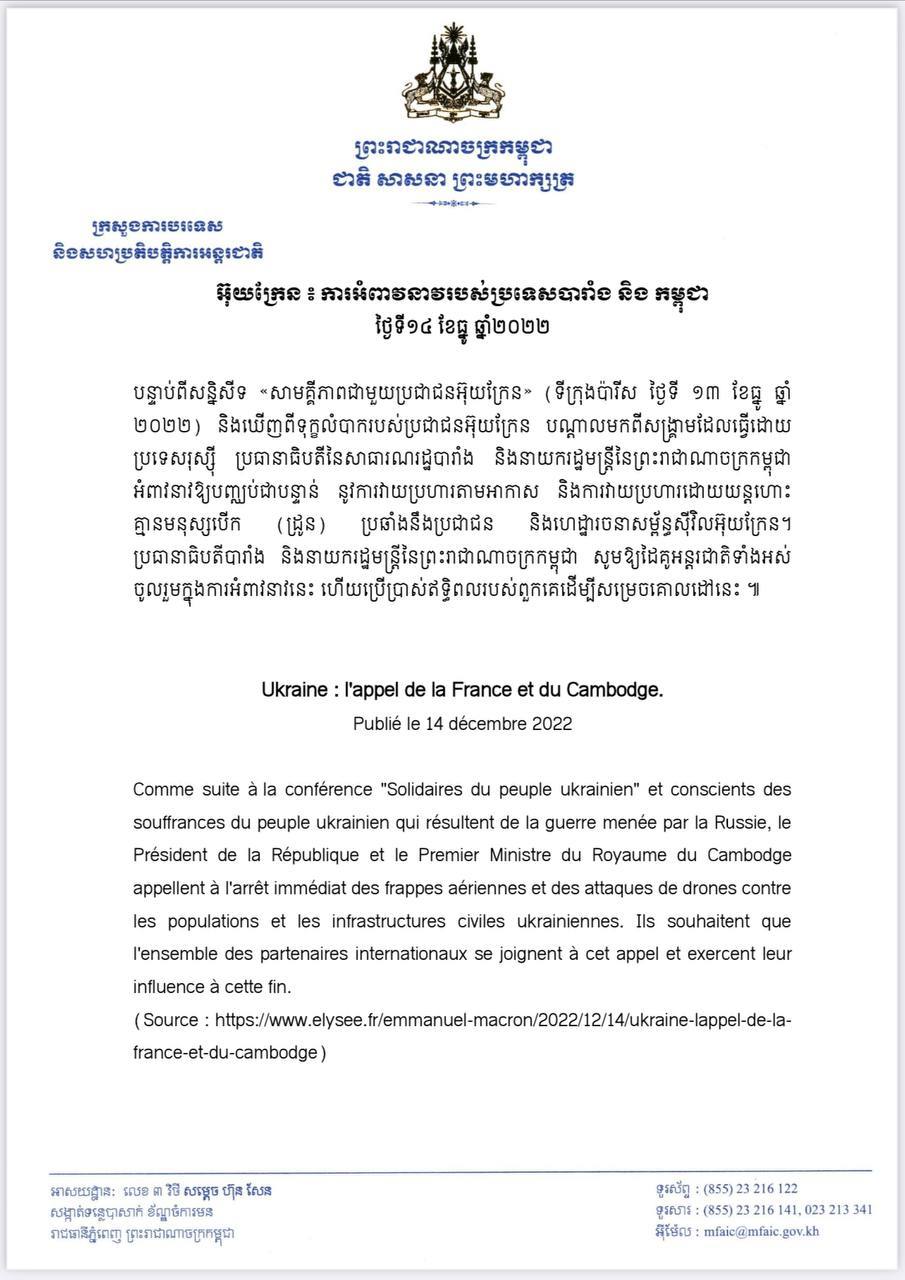បារាំង និងកម្ពុជា អំពាវនាវឱ្យបញ្ឈប់ការវាយប្រហារតាមផ្លូវអាកាស និងយន្តហោះគ្មានមនុស្សបើក នៅអ៊ុយក្រែន