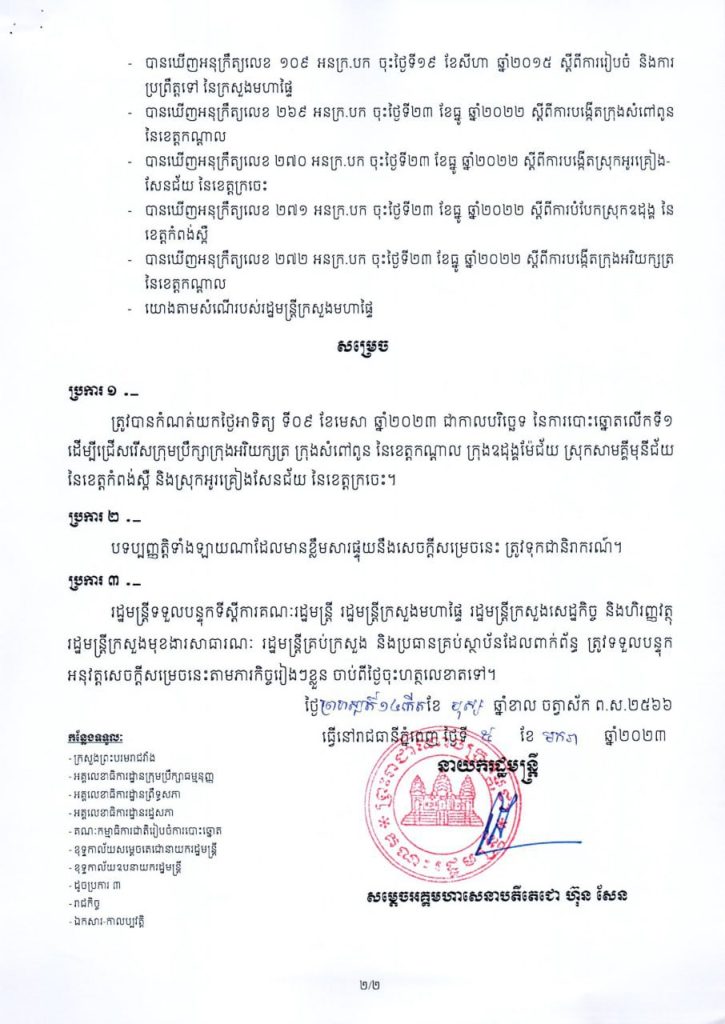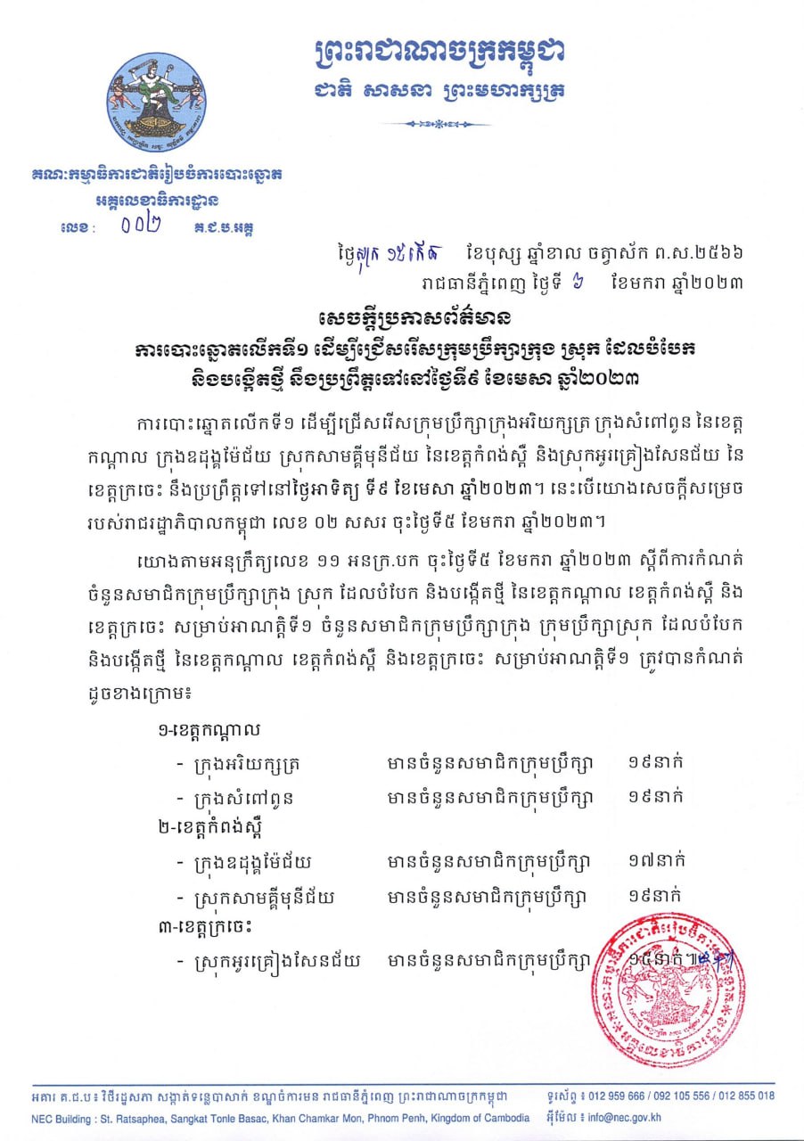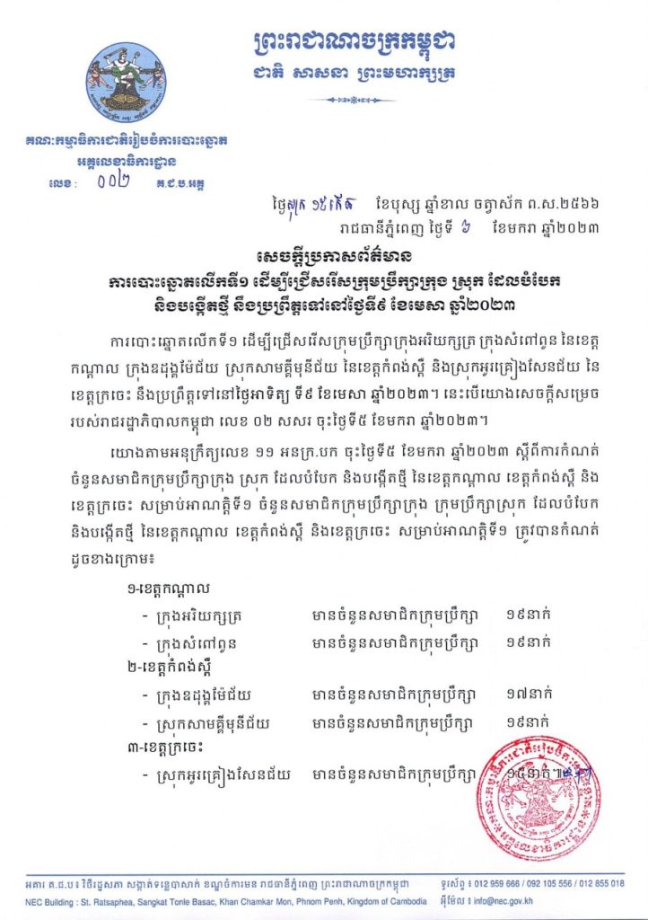 សេចក្តីប្រកាសព័ត៌មាន ការបោះឆ្នោតលើកទី១ ដើម្បីជ្រើសរើសក្រុមប្រឹក្សាក្រុង ស្រុក ដែលបំបែក និងបង្កើតថ្មី នឹងប្រព្រឹត្តទៅនៅថ្ងៃទី៩ ខែមេសា ឆ្នាំ២០២៣